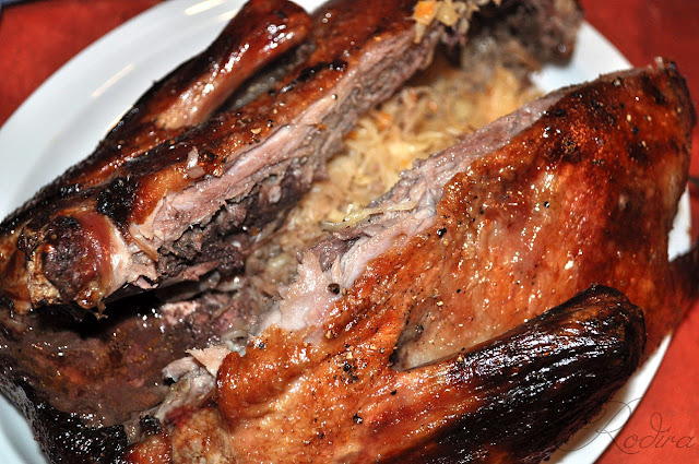 Эту утку я запекала с квашеной капустой, и сверху смазала мёдом.