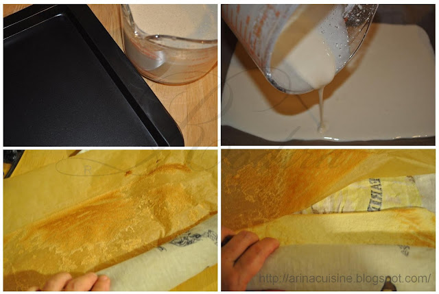 Вылить смесь на противень, застеленный жаропрочной бумагой - у меня специальный противень для рулетов, очень удобно, советую и Вам такой купить