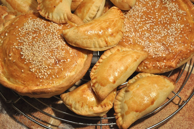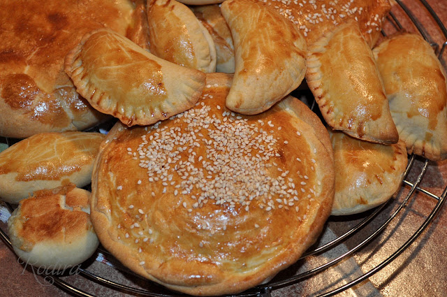 Смазать пироги и пирожкиг чуть-чуть взбитым яйцом, посыпать кунжутом,