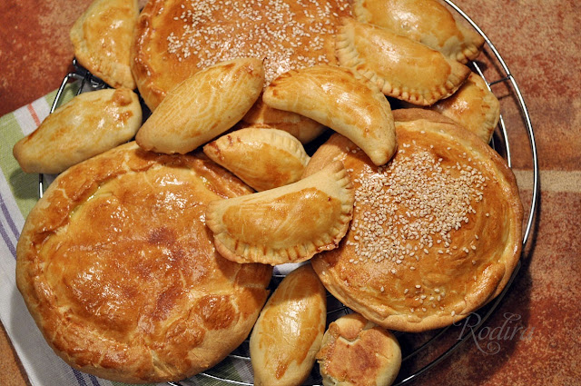 Смазать пироги и пирожкиг чуть-чуть взбитым яйцом, посыпать кунжутом,